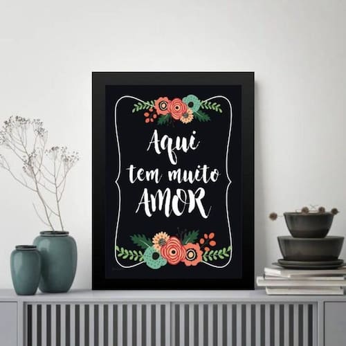 Quadro aqui tem muito amor 24x18cm Cor: moldura branca Informações do produto tire todas as suas dúvidas no descritivo abaixo: decoração para quarto, sala, cozinha, escritório, área gourmet e muito mais. Chega de paredes vazias medidas - cada peça tem 24x18cm a5 . Material do papel - papel fotográfico brilhante de altíssima resolução acabamento - todos os quadros são acompanhados de uma película de acetato para proteção da imagem. - os quadros são embalados de forma segura com plástico bolha com camada dupla de acordo com o tamanho dos quadros. Garantia - garantia de 3 meses. Meu quadro chegou. Como posso fixá-lo Você precisa apenas de um martelo e um prego, pois os quadros já vão acompanhados de penduradores. Esta é a forma mais indicada. Caso prefira, você pode utilizar uma fita dupla face neste caso, sugerimos de alta qualidade para evitar que descole e seu quadro caia . Como posso limpar meu quadro A limpeza é feita como um móvel comum da sua casa. Apenas um pano seco ou espanador são suficientes para tal