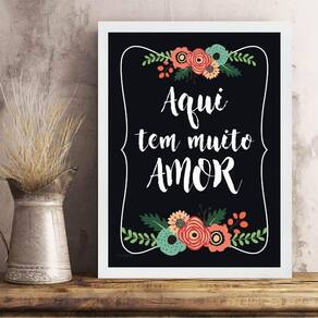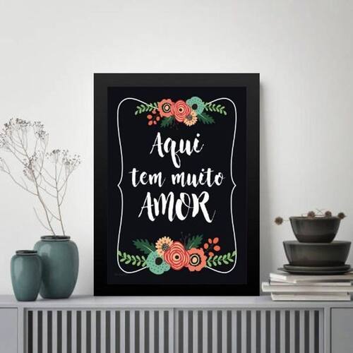 Quadro aqui tem muito amor 45x34cm - com vidro Cor: moldura preta Informações do produto tire todas as suas dúvidas no descritivo abaixo: decoração para quarto, sala, cozinha, escritório, área gourmet e muito mais. Chega de paredes vazias medidas - cada peça tem 45x34cm a3 . Material do papel - papel fotográfico brilhante de altíssima resolução acabamento - todos os quadros são acompanhados de vidro para proteção da imagem. - moldura em madeira maciça na cor preta ou branca conforme produto escolhido e pendurador . - os quadros são embalados de forma segura com plástico bolha com camada dupla de acordo com o tamanho dos quadros. Garantia - garantia de 3 meses. Meu quadro chegou. Como posso fixá-lo Você precisa apenas de um martelo e um prego, pois os quadros já vão acompanhados de penduradores. Esta é a forma mais indicada. Como posso limpar meu quadro A limpeza é feita como um móvel comum da sua casa. Apenas um pano seco ou espanador são suficientes para tal Ean: 7894794126342