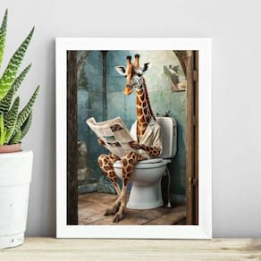 Quadro banheiro girafa lendo jornal no vaso 24x18cm Moldura: madeira preta Informações do produto tire todas as suas dúvidas no descritivo abaixo: decoração para quarto, sala, cozinha, escritório, área gourmet e muito mais. Chega de paredes vazias medidas - cada peça tem 24x18cm a5 . Material do papel - papel fotográfico brilhante de altíssima resolução acabamento - todos os quadros são acompanhados de uma película de acetato para proteção da imagem. - os quadros são embalados de forma segura com plástico bolha com camada dupla de acordo com o tamanho dos quadros. Garantia - garantia de 3 meses. Meu quadro chegou. Como posso fixá-lo Você precisa apenas de um martelo e um prego, pois os quadros já vão acompanhados de penduradores. Esta é a forma mais indicada. Caso prefira, você pode utilizar uma fita dupla face neste caso, sugerimos de alta qualidade para evitar que descole e seu quadro caia . Como posso limpar meu quadro A limpeza é feita como um móvel comum da sua casa. Apenas um pano seco ou espanador são suficientes para tal