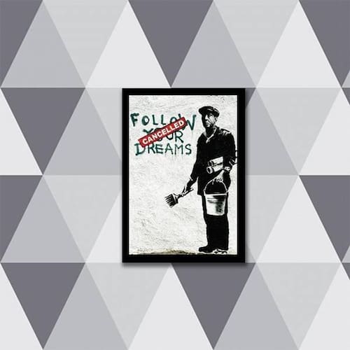 Quadro banksy follow your dreams 45x34cm - com vidro Moldura: madeira preta Informações do produto tire todas as suas dúvidas no descritivo abaixo: decoração para quarto, sala, cozinha, escritório, área gourmet e muito mais. Chega de paredes vazias medidas - cada peça tem 45x34cm a3 . Material do papel - papel fotográfico brilhante de altíssima resolução acabamento - todos os quadros são acompanhados de vidro para proteção da imagem. - moldura em madeira maciça na cor preta e pendurador . - os quadros são embalados de forma segura com plástico bolha com camada dupla de acordo com o tamanho dos quadros. Garantia - garantia de 3 meses. Meu quadro chegou. Como posso fixá-lo Você precisa apenas de um martelo e um prego, pois os quadros já vão acompanhados de penduradores. Esta é a forma mais indicada. Como posso limpar meu quadro A limpeza é feita como um móvel comum da sua casa. Apenas um pano seco ou espanador são suficientes para tal Ean: 7895142163026