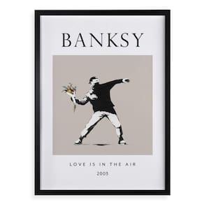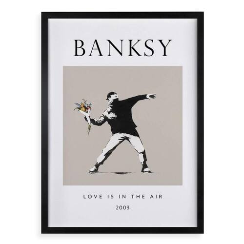 Quadro banksy love is in the air 33x24cm Cor: moldura preta Informações do produto tire todas as suas dúvidas no descritivo abaixo: decoração para quarto, sala, cozinha, escritório, área gourmet e muito mais. Chega de paredes vazias medidas - cada peça tem 33x24cm a4 . Material do papel - papel fotográfico brilhante de altíssima resolução acabamento - todos os quadros são acompanhados de uma película de acetato para proteção da imagem. - os quadros são embalados de forma segura com plástico bolha com camada dupla de acordo com o tamanho dos quadros. - de 3 meses. Meu quadro chegou. Como posso fixá-lo Você precisa apenas de um martelo e um prego, pois os quadros já vão acompanhados de penduradores. Esta é a forma mais indicada. Caso prefira, você pode utilizar uma fita dupla face neste caso, sugerimos de alta qualidade para evitar que descole e seu quadro caia . Como posso limpar meu quadro A limpeza é feita como um móvel comum da sua casa. Apenas um pano seco ou espanador são suficientes para tal Marca: Não Informado