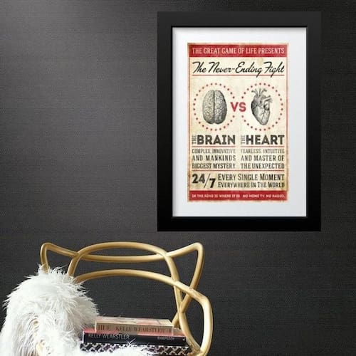 Quadro batalha cérebro x coração - 60x48cm Moldura: madeira branca Informações do produto tire todas as suas dúvidas no descritivo abaixo: decoração para quarto, sala, cozinha, escritório, área gourmet e muito mais. Chega de paredes vazias medidas - cada peça tem 60x48cm . Material do papel - papel fotográfico brilhante de altíssima resolução acabamento - todos os quadros são acompanhados de vidro para proteção da imagem. - moldura em madeira maciça na cor preta ou branca conforme produto escolhido e pendurador. - paspatur branco com 7cm de largura - os quadros são embalados de forma segura com plástico bolha com camada dupla de acordo com o tamanho dos quadros. Garantia - garantia de 3 meses. Meu quadro chegou. Como posso fixá-lo Você precisa apenas de um martelo e um prego, pois os quadros já vão acompanhados de penduradores. Esta é a forma mais indicada. Como posso limpar meu quadro A limpeza é feita como um móvel comum da sua casa. Apenas um pano seco ou espanador são suficientes para tal