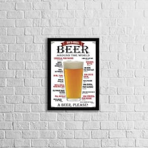 Quadro beer around the world 24x18cm Moldura: madeira preta Informações do produto tire todas as suas dúvidas no descritivo abaixo: decoração para quarto, sala, cozinha, escritório, área gourmet e muito mais. Chega de paredes vazias medidas - cada peça tem 24x18cm a5 . Material do papel - papel fotográfico brilhante de altíssima resolução acabamento - todos os quadros são acompanhados de uma película de acetato para proteção da imagem. - moldura em madeira maciça na cor branca e pendurador móvel que pode ser retirado facilmente caso deseje fixar com fita dupla face. - os quadros são embalados de forma segura com plástico bolha com camada dupla de acordo com o tamanho dos quadros. - de 3 meses prazo de envio pedimos 24 horas úteis no máximo para enviar seu pedido após o envio, segue os prazos normais dos correios, cerca de 7 exceto para norte e nordeste, que pode ser de até 14 . Em diversas cidades, este prazo normalmente é reduzido, mas depende do prazo dos correios. Meu quadro chegou. Como posso fixá-lo Você precisa apenas de um martelo e um prego, pois os quadros já vão acompanhados de penduradores. Esta é a forma mais indicada. Caso prefira, você pode utilizar uma fita dupla face neste caso, sugerimos de alta qualidade para evitar que descole e seu quadro caia . Como posso limpar meu quadro A limpeza é feita como um móvel comum da sua casa. Apenas um pano seco ou espanador são suficientes para tal Marca: Não Informado