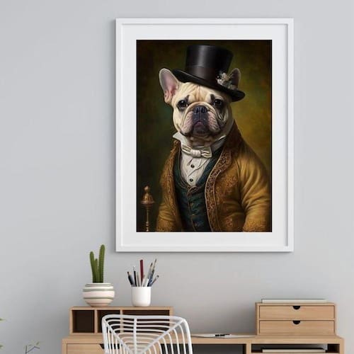 Quadro bulldog francês cavalheiro - 60x48cm Moldura: madeira branca Informações do produto tire todas as suas dúvidas no descritivo abaixo: decoração para quarto, sala, cozinha, escritório, área gourmet e muito mais. Chega de paredes vazias medidas - cada peça tem 60x48cm . Material do papel - papel fotográfico brilhante de altíssima resolução acabamento - todos os quadros são acompanhados de vidro para proteção da imagem. - moldura em madeira maciça na cor preta ou branca conforme produto escolhido e pendurador. - paspatur branco com 7cm de largura - os quadros são embalados de forma segura com plástico bolha com camada dupla de acordo com o tamanho dos quadros. Garantia - garantia de 3 meses. Meu quadro chegou. Como posso fixá-lo Você precisa apenas de um martelo e um prego, pois os quadros já vão acompanhados de penduradores. Esta é a forma mais indicada. Como posso limpar meu quadro A limpeza é feita como um móvel comum da sua casa. Apenas um pano seco ou espanador são suficientes para tal