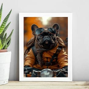 Quadro bulldog francês motociclista 33x24cm - com vidro Moldura: madeira branca Informações do produto tire todas as suas dúvidas no descritivo abaixo: decoração para quarto, sala, cozinha, escritório, área gourmet e muito mais. Chega de paredes vazias medidas - cada peça tem 33x24cm a4 . Material do papel - papel fotográfico brilhante de altíssima resolução acabamento - todos os quadros são acompanhados de vidro para proteção da imagem. - moldura em madeira maciça na cor preta ou branca conforme produto escolhido e pendurador . - os quadros são embalados de forma segura com plástico bolha com camada dupla de acordo com o tamanho dos quadros. Garantia - garantia de 3 meses. Meu quadro chegou. Como posso fixá-lo Você precisa apenas de um martelo e um prego, pois os quadros já vão acompanhados de penduradores. Esta é a forma mais indicada. Como posso limpar meu quadro A limpeza é feita como um móvel comum da sua casa. Apenas um pano seco ou espanador são suficientes para tal