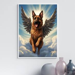 Quadro cão pastor alemão com asas 33x24cm Moldura: madeira branca Informações do produto tire todas as suas dúvidas no descritivo abaixo: decoração para quarto, sala, cozinha, escritório, área gourmet e muito mais. Chega de paredes vazias medidas - cada peça tem 33x24cm a4 . Material do papel - papel fotográfico brilhante de altíssima resolução acabamento - todos os quadros são acompanhados de uma película de acetato para proteção da imagem. - os quadros são embalados de forma segura com plástico bolha com camada dupla de acordo com o tamanho dos quadros. Garantia - garantia de 3 meses. Meu quadro chegou. Como posso fixá-lo Você precisa apenas de um martelo e um prego, pois os quadros já vão acompanhados de penduradores. Esta é a forma mais indicada. Caso prefira, você pode utilizar uma fita dupla face neste caso, sugerimos de alta qualidade para evitar que descole e seu quadro caia . Como posso limpar meu quadro A limpeza é feita como um móvel comum da sua casa. Apenas um pano seco ou espanador são suficientes para tal