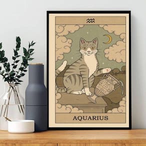 Quadro carta tarot gato signo aquário 24x18cm - com vidro Moldura: madeira preta Informações do produto tire todas as suas dúvidas no descritivo abaixo: decoração para quarto, sala, cozinha, escritório, área gourmet e muito mais. Chega de paredes vazias medidas - cada peça tem 24x18cm a5 . Material do papel - papel fotográfico brilhante de altíssima resolução acabamento - todos os quadros são acompanhados de vidro para proteção da imagem. - moldura em madeira maciça na cor preta ou branca conforme produto escolhido e pendurador . - os quadros são embalados de forma segura com plástico bolha com camada dupla de acordo com o tamanho dos quadros. Garantia - garantia de 3 meses. Meu quadro chegou. Como posso fixá-lo Você precisa apenas de um martelo e um prego, pois os quadros já vão acompanhados de penduradores. Esta é a forma mais indicada. Como posso limpar meu quadro A limpeza é feita como um móvel comum da sua casa. Apenas um pano seco ou espanador são suficientes para tal Ean: 7895385200427