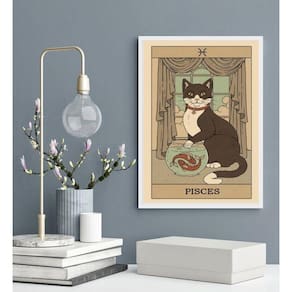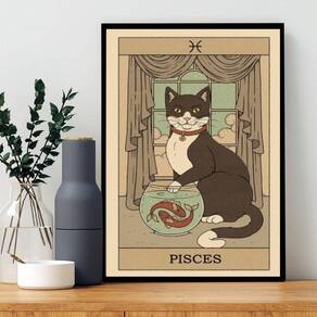 Quadro carta tarot gato signo peixes 33x24cm - com vidro Moldura: madeira preta Informações do produto tire todas as suas dúvidas no descritivo abaixo: decoração para quarto, sala, cozinha, escritório, área gourmet e muito mais. Chega de paredes vazias medidas - cada peça tem 33x24cm a4 . Material do papel - papel fotográfico brilhante de altíssima resolução acabamento - todos os quadros são acompanhados de vidro para proteção da imagem. - moldura em madeira maciça na cor preta ou branca conforme produto escolhido e pendurador . - os quadros são embalados de forma segura com plástico bolha com camada dupla de acordo com o tamanho dos quadros. Garantia - garantia de 3 meses. Meu quadro chegou. Como posso fixá-lo Você precisa apenas de um martelo e um prego, pois os quadros já vão acompanhados de penduradores. Esta é a forma mais indicada. Como posso limpar meu quadro A limpeza é feita como um móvel comum da sua casa. Apenas um pano seco ou espanador são suficientes para tal Ean: 7895911351869