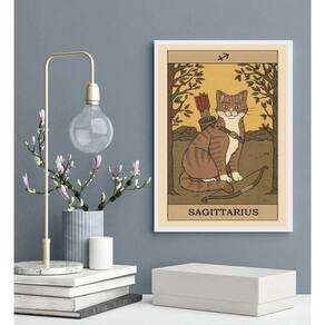 Quadro carta tarot gato signo sagitário 33x24cm - com vidro Moldura: madeira preta Informações do produto tire todas as suas dúvidas no descritivo abaixo: decoração para quarto, sala, cozinha, escritório, área gourmet e muito mais. Chega de paredes vazias medidas - cada peça tem 33x24cm a4 . Material do papel - papel fotográfico brilhante de altíssima resolução acabamento - todos os quadros são acompanhados de vidro para proteção da imagem. - moldura em madeira maciça na cor preta ou branca conforme produto escolhido e pendurador . - os quadros são embalados de forma segura com plástico bolha com camada dupla de acordo com o tamanho dos quadros. Garantia - garantia de 3 meses. Meu quadro chegou. Como posso fixá-lo Você precisa apenas de um martelo e um prego, pois os quadros já vão acompanhados de penduradores. Esta é a forma mais indicada. Como posso limpar meu quadro A limpeza é feita como um móvel comum da sua casa. Apenas um pano seco ou espanador são suficientes para tal Ean: 7890183403001