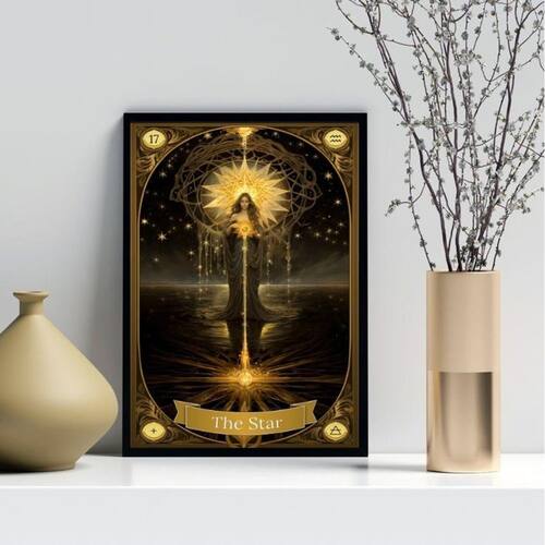 Quadro carta tarot vintage - the star 45x34cm Cor: moldura preta Informações do produto tire todas as suas dúvidas no descritivo abaixo: decoração para quarto, sala, cozinha, escritório, área gourmet e muito mais. Chega de paredes vazias. Medidas - cada peça tem 45x34cm a3 . Material do papel - papel fotográfico brilhante de altíssima resolução acabamento - todos os quadros são acompanhados de uma película de acetato para proteção da imagem. - os quadros são embalados de forma segura com plástico bolha com camada dupla de acordo com o tamanho dos quadros. Garantia - garantia de 3 meses. Meu quadro chegou. Como posso fixá-lo Você precisa apenas de um martelo e um prego, pois os quadros já vão acompanhados de penduradores. Esta é a forma mais indicada. Caso prefira, você pode utilizar uma fita dupla face neste caso, sugerimos de alta qualidade para evitar que descole e seu quadro caia . Como posso limpar meu quadro A limpeza é feita como um móvel comum da sua casa. Apenas um pano seco ou espanador são suficientes para tal