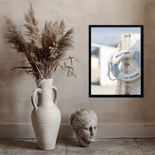 Quadro casa de praia - welcome on board 33x24cm Moldura: madeira preta Informações do produto tire todas as suas dúvidas no descritivo abaixo: decoração para quarto, sala, cozinha, escritório, área gourmet e muito mais. Chega de paredes vazias medidas - cada peça tem 33x24cm a4 . Material do papel - papel fotográfico brilhante de altíssima resolução acabamento - todos os quadros são acompanhados de uma película de acetato para proteção da imagem. - moldura em madeira maciça na cor preta ou branca conforme produto escolhido e pendurador móvel que pode ser retirado facilmente caso deseje fixar com fita dupla face. - os quadros são embalados de forma segura com plástico bolha com camada dupla de acordo com o tamanho dos quadros. Garantia - garantia de 3 meses. Meu quadro chegou. Como posso fixá-lo Você precisa apenas de um martelo e um prego, pois os quadros já vão acompanhados de penduradores. Esta é a forma mais indicada. Caso prefira, você pode utilizar uma fita dupla face neste caso, sugerimos de alta qualidade para evitar que descole e seu quadro caia . Como posso limpar meu quadro A limpeza é feita como um móvel comum da sua casa. Apenas um pano seco ou espanador são suficientes para tal