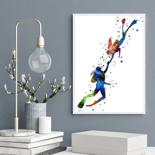 Quadro casal de mergulhadores - aquarela 45x34cm - com vidro Moldura: madeira preta Informações do produto tire todas as suas dúvidas no descritivo abaixo: decoração para quarto, sala, cozinha, escritório, área gourmet e muito mais. Chega de paredes vazias medidas - cada peça tem 45x34cm a3 . Material do papel - papel fotográfico brilhante de altíssima resolução acabamento - todos os quadros são acompanhados de vidro para proteção da imagem. - moldura em madeira maciça na cor preta ou branca conforme produto escolhido e pendurador . - os quadros são embalados de forma segura com plástico bolha com camada dupla de acordo com o tamanho dos quadros. Garantia - garantia de 3 meses. Meu quadro chegou. Como posso fixá-lo Você precisa apenas de um martelo e um prego, pois os quadros já vão acompanhados de penduradores. Esta é a forma mais indicada. Como posso limpar meu quadro A limpeza é feita como um móvel comum da sua casa. Apenas um pano seco ou espanador são suficientes para tal