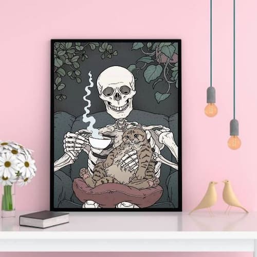 Quadro caveira com gatinho tomando café 24x18cm Moldura: madeira preta