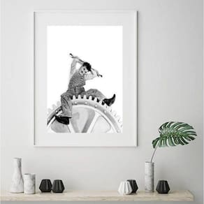 Quadro charlie chaplin engrenagem - 60x48cm Moldura: madeira branca Informações do produto tire todas as suas dúvidas no descritivo abaixo: decoração para quarto, sala, cozinha, escritório, área gourmet e muito mais. Chega de paredes vazias medidas - cada peça tem 60x48cm . Material do papel - papel fotográfico brilhante de altíssima resolução acabamento - todos os quadros são acompanhados de vidro para proteção da imagem. - moldura em madeira maciça na cor preta ou branca conforme produto escolhido e pendurador. - paspatur branco com 7cm de largura - os quadros são embalados de forma segura com plástico bolha com camada dupla de acordo com o tamanho dos quadros. Garantia - garantia de 3 meses. Meu quadro chegou. Como posso fixá-lo Você precisa apenas de um martelo e um prego, pois os quadros já vão acompanhados de penduradores. Esta é a forma mais indicada. Como posso limpar meu quadro A limpeza é feita como um móvel comum da sua casa. Apenas um pano seco ou espanador são suficientes para tal