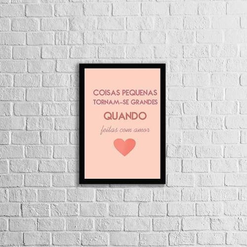 Quadro coisas pequenas feitas com amor 24x18cm Moldura: madeira preta Informações do produto tire todas as suas dúvidas no descritivo abaixo: decoração para quarto, sala, cozinha, escritório, área gourmet e muito mais. Chega de paredes vazias medidas - cada peça tem 24x18cm a5 . Material do papel - papel fotográfico brilhante de altíssima resolução acabamento - todos os quadros são acompanhados de uma película de acetato para proteção da imagem. - moldura em madeira maciça na cor branca e pendurador móvel que pode ser retirado facilmente caso deseje fixar com fita dupla face. - os quadros são embalados de forma segura com plástico bolha com camada dupla de acordo com o tamanho dos quadros. Garantia - garantia de 3 meses prazo de envio pedimos 24 horas úteis no máximo para enviar seu pedido após o envio, segue os prazos normais dos correios, cerca de 7 dias úteis exceto para norte e nordeste, que pode ser de até 14 dias úteis. Em diversas cidades, este prazo normalmente é reduzido, mas depende do prazo dos correios. Meu quadro chegou. Como posso fixá-lo Você precisa apenas de um martelo e um prego, pois os quadros já vão acompanhados de penduradores. Esta é a forma mais indicada. Caso prefira, você pode utilizar uma fita dupla face neste caso, sugerimos de alta qualidade para evitar que descole e seu quadro caia . Como posso limpar meu quadro A limpeza é feita como um móvel comum da sua casa. Apenas um pano seco ou espanador são suficientes para tal