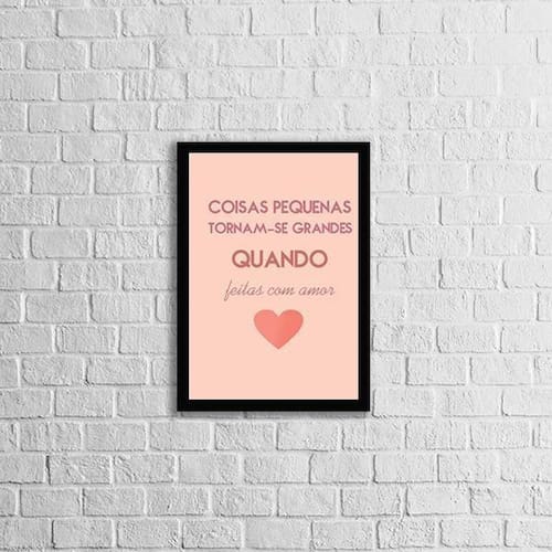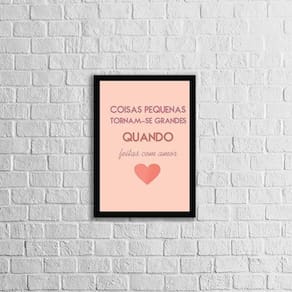 Quadro coisas pequenas feitas com amor 45x34cm - com vidro Moldura: madeira preta Informações do produto tire todas as suas dúvidas no descritivo abaixo: decoração para quarto, sala, cozinha, escritório, área gourmet e muito mais. Chega de paredes vazias medidas - cada peça tem 45x34cm a3 . Material do papel - papel fotográfico brilhante de altíssima resolução acabamento - todos os quadros são acompanhados de vidro para proteção da imagem. - moldura em madeira maciça na cor preta e pendurador . - os quadros são embalados de forma segura com plástico bolha com camada dupla de acordo com o tamanho dos quadros. - de 3 meses. Meu quadro chegou. Como posso fixá-lo Você precisa apenas de um martelo e um prego, pois os quadros já vão acompanhados de penduradores. Esta é a forma mais indicada. Como posso limpar meu quadro A limpeza é feita como um móvel comum da sua casa. Apenas um pano seco ou espanador são suficientes para tal Ean: 7895142163668