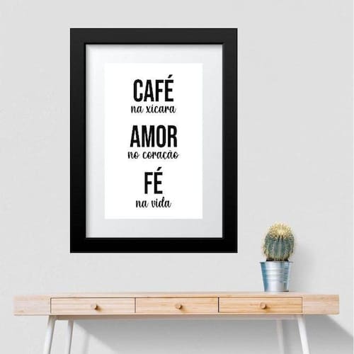 Quadro cozinha café amor fé - 60x48cm Moldura: madeira preta Informações do produto tire todas as suas dúvidas no descritivo abaixo: decoração para quarto, sala, cozinha, escritório, área gourmet e muito mais. Chega de paredes vazias medidas - cada peça tem 60x48cm . Material do papel - papel fotográfico brilhante de altíssima resolução acabamento - todos os quadros são acompanhados de vidro para proteção da imagem. - moldura em madeira maciça na cor preta ou branca conforme produto escolhido e pendurador. - paspatur branco com 7cm de largura - os quadros são embalados de forma segura com plástico bolha com camada dupla de acordo com o tamanho dos quadros. Garantia - garantia de 3 meses. Meu quadro chegou. Como posso fixá-lo Você precisa apenas de um martelo e um prego, pois os quadros já vão acompanhados de penduradores. Esta é a forma mais indicada. Como posso limpar meu quadro A limpeza é feita como um móvel comum da sua casa. Apenas um pano seco ou espanador são suficientes para tal