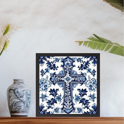 Quadro cruz estilo azulejo português azul e branco - 33x33cm - com vidro Cor: moldura branca Informações do produto tire todas as suas dúvidas no descritivo abaixo: decoração para quarto, sala, cozinha, escritório, área gourmet e muito mais. Chega de paredes vazias medidas - cada peça tem 33x33cm. Material do papel - papel fotográfico brilhante de altíssima resolução acabamento - todos os quadros são acompanhados de vidro para proteção da imagem. - moldura em madeira maciça na cor preta ou branca conforme produto escolhido e pendurador . - os quadros são embalados de forma segura com plástico bolha com camada dupla de acordo com o tamanho dos quadros. - de 3 meses. Meu quadro chegou. Como posso fixá-lo Você precisa apenas de um martelo e um prego, pois os quadros já vão acompanhados de penduradores. Esta é a forma mais indicada. Como posso limpar meu quadro A limpeza é feita como um móvel comum da sua casa. Apenas um pano seco ou espanador são suficientes para tal Marca: Não Informado