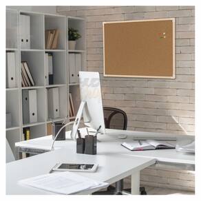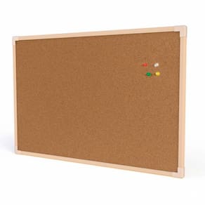 Descrição do Produto: Quadro de aviso cortiça Stalo com moldura em madeira pinus de reflorestamento e cantos plásticos, tampo com acabamento em cortiça, base em cardboard.