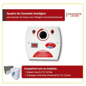 Compatível com os geradores de vapor Steam Inox Sodramar e Compact Line Inox Universal Sodramar, acompanha bulbo sensor (que possui a finalidade de registrar a temperatura do ambiente e assim controlá-la automaticamente) e tampa de acabamento para proteção do sensor. O quadro de comando é fabricado em polietileno e deve ser fixado ou concretado na parte externa do cômodo de sauna, numa altura aproximada de 1,60 m.