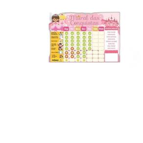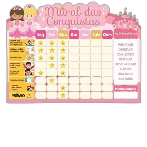 Incluso: Quadro tema princesas; Imãs de tarefas; Imãs em branco para escrever outras tarefas ou o nome da criança ; 1 manual.