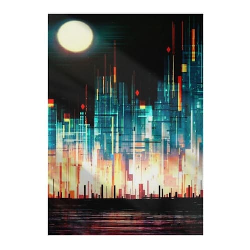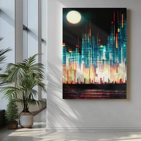 Estilo e Modernidade: O quadro apresenta uma cidade iluminada, com prédios geométricos em tons de azul, laranja e vermelho, refletidos na água, sob um céu escuro e uma lua brilhante. As linhas verticais e horizontais, juntamente com as cores contrastantes, trazem uma sensação de movimento e profundidade, capturando a energia e o dinamismo da vida urbana. Ideal para ambientes modernos que pedem um toque de arte abstrata e sofisticada.