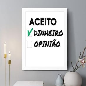 Quadro decorativo aceito dinheiro x opinião 24x18cm Cor: moldura branca Informações do produto tire todas as suas dúvidas no descritivo abaixo: decoração para quarto, sala, cozinha, escritório, área gourmet e muito mais. Chega de paredes vazias medidas - cada peça tem 24x18cm a5 . Material do papel - papel fotográfico brilhante de altíssima resolução acabamento - todos os quadros são acompanhados de uma película de acetato para proteção da imagem. - os quadros são embalados de forma segura com plástico bolha com camada dupla de acordo com o tamanho dos quadros. Garantia - garantia de 3 meses. Meu quadro chegou. Como posso fixá-lo Você precisa apenas de um martelo e um prego, pois os quadros já vão acompanhados de penduradores. Esta é a forma mais indicada. Caso prefira, você pode utilizar uma fita dupla face neste caso, sugerimos de alta qualidade para evitar que descole e seu quadro caia . Como posso limpar meu quadro A limpeza é feita como um móvel comum da sua casa. Apenas um pano seco ou espanador são suficientes para tal