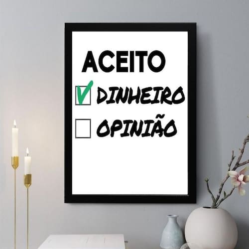 Quadro decorativo aceito dinheiro x opinião 33x24cm
