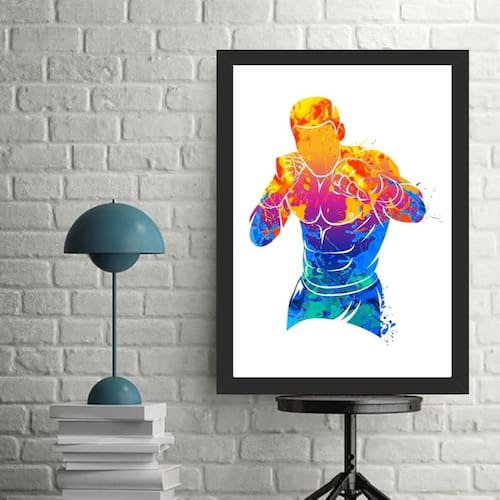Quadro decorativo arte boxe - boxeador 45x34cm Cor: moldura preta Informações do produto tire todas as suas dúvidas no descritivo abaixo: decoração para quarto, sala, cozinha, escritório, área gourmet e muito mais. Chega de paredes vazias. Medidas - cada peça tem 45x34cm a3 . Material do papel - papel fotográfico brilhante de altíssima resolução acabamento - todos os quadros são acompanhados de uma película de acetato para proteção da imagem. - os quadros são embalados de forma segura com plástico bolha com camada dupla de acordo com o tamanho dos quadros. Garantia - garantia de 3 meses. Meu quadro chegou. Como posso fixá-lo Você precisa apenas de um martelo e um prego, pois os quadros já vão acompanhados de penduradores. Esta é a forma mais indicada. Caso prefira, você pode utilizar uma fita dupla face neste caso, sugerimos de alta qualidade para evitar que descole e seu quadro caia . Como posso limpar meu quadro A limpeza é feita como um móvel comum da sua casa. Apenas um pano seco ou espanador são suficientes para tal