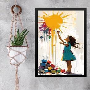 Quadro decorativo arte criança pintando sol 24x18cm - com vidro Cor: moldura branca Informações do produto tire todas as suas dúvidas no descritivo abaixo: decoração para quarto, sala, cozinha, escritório, área gourmet e muito mais. Chega de paredes vazias medidas - cada peça tem 24x18cm a5 . Material do papel - papel fotográfico brilhante de altíssima resolução acabamento - todos os quadros são acompanhados de vidro para proteção da imagem. - moldura em madeira maciça na cor preta ou branca conforme produto escolhido e pendurador . - os quadros são embalados de forma segura com plástico bolha com camada dupla de acordo com o tamanho dos quadros. Garantia - garantia de 3 meses. Meu quadro chegou. Como posso fixá-lo Você precisa apenas de um martelo e um prego, pois os quadros já vão acompanhados de penduradores. Esta é a forma mais indicada. Como posso limpar meu quadro A limpeza é feita como um móvel comum da sua casa. Apenas um pano seco ou espanador são suficientes para tal