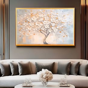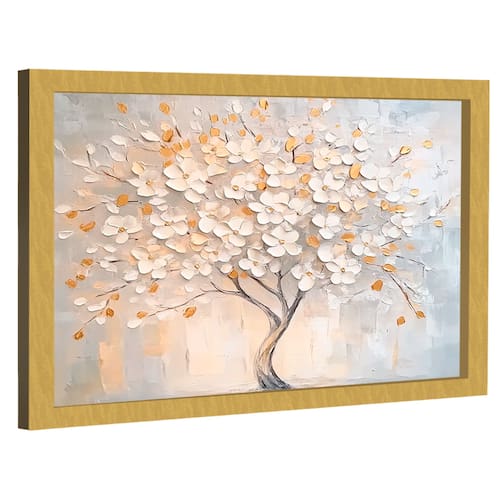Quadro Decorativo Árvore de Flores Brancas Moldura Dourada - 60x40cm -