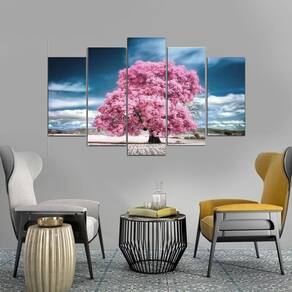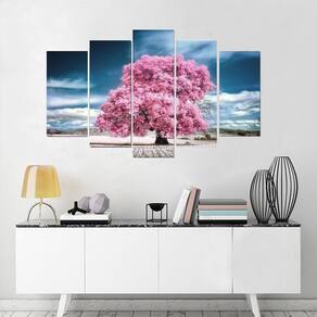 Quadro Decorativo Arvore Rosa Com Céu Azul 5 Peças