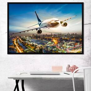 Quadro Decorativo Avião Decolando Moldura Branca e Vidro - 150x100cm -