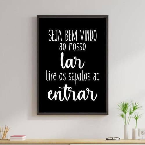 Quadro decorativo bem vindo e tire os sapatos 34x23cm - moldura branca Tamanho: a4 20 x 30 Acabamento: película de acetato Moldura: madeira branca Informações do produto Tire todas as suas dúvidas no descritivo abaixo: Decoração para quarto, sala, cozinha, escritório, área gourmet e muito mais. Chega de paredes vazias Medidas - cada peça tem 34x23cm a4 . Material do papel - papel fotográfico brilhante de altíssima resolução Acabamento - todos os quadros são acompanhados de uma película de acetato para proteção da imagem. - moldura em madeira maciça na cor branca e pendurador móvel que pode ser retirado facilmente caso deseje fixar com fita dupla face. - os quadros são embalados de forma segura com plástico bolha com camada dupla de acordo com o tamanho dos quadros. - de 3 meses Meu quadro chegou. Como posso fixá-lo Você precisa apenas de um martelo e um prego, pois os quadros já vão acompanhados de penduradores. Esta é a forma mais indicada. Caso prefira, você pode utilizar uma fita dupla face neste caso, sugerimos de alta qualidade para evitar que descole e seu quadro caia . Como posso limpar meu quadro A limpeza é feita como um móvel comum da sua casa. Apenas um pano seco ou espanador são suficientes para tal Ean: 7892090312094