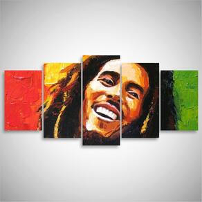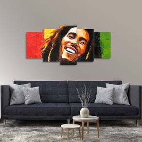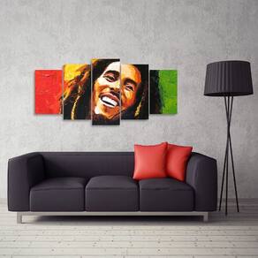 Quadro decorativo Bob Marley Música Dimensões do Produto: Tamanho total do produto: 125x60 cm Comprimento x Altura 02 Peças menores: 25x40 cm 02 Peças Médias: 25x50 cm 01 Peça Central: 25x60 cm. Espaçamento entre as peças de 1 cm - Tamanho total com espaçamentos 129x60 cm. Espessura do produto - 9 mm