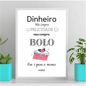 Quadro decorativo bolo felicidade 24x18cm - com vidro Moldura: madeira branca Informações do produto tire todas as suas dúvidas no descritivo abaixo: decoração para quarto, sala, cozinha, escritório, área gourmet e muito mais. Chega de paredes vazias medidas - cada peça tem 24x18cm a5 . Material do papel - papel fotográfico brilhante de altíssima resolução acabamento - todos os quadros são acompanhados de vidro para proteção da imagem. - moldura em madeira maciça na cor preta e pendurador . - os quadros são embalados de forma segura com plástico bolha com camada dupla de acordo com o tamanho dos quadros. Garantia - garantia de 3 meses. Meu quadro chegou. Como posso fixá-lo Você precisa apenas de um martelo e um prego, pois os quadros já vão acompanhados de penduradores. Esta é a forma mais indicada. Como posso limpar meu quadro A limpeza é feita como um móvel comum da sua casa. Apenas um pano seco ou espanador são suficientes para tal