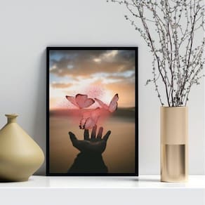 Quadro decorativo borboletas mágicas rosa 24x18cm - com vidro Moldura: madeira preta Informações do produto tire todas as suas dúvidas no descritivo abaixo: decoração para quarto, sala, cozinha, escritório, área gourmet e muito mais. Chega de paredes vazias medidas - cada peça tem 24x18cm a5 . Material do papel - papel fotográfico brilhante de altíssima resolução acabamento - todos os quadros são acompanhados de vidro para proteção da imagem. - moldura em madeira maciça na cor preta ou branca conforme produto escolhido e pendurador . - os quadros são embalados de forma segura com plástico bolha com camada dupla de acordo com o tamanho dos quadros. Garantia - garantia de 3 meses. Meu quadro chegou. Como posso fixá-lo Você precisa apenas de um martelo e um prego, pois os quadros já vão acompanhados de penduradores. Esta é a forma mais indicada. Como posso limpar meu quadro A limpeza é feita como um móvel comum da sua casa. Apenas um pano seco ou espanador são suficientes para tal Ean: 7896316120999