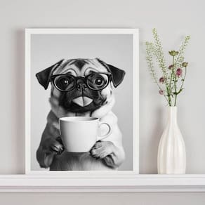 Quadro decorativo cachorrinho pug bebendo café 45x34cm Cor: moldura branca Informações do produto tire todas as suas dúvidas no descritivo abaixo: decoração para quarto, sala, cozinha, escritório, área gourmet e muito mais. Chega de paredes vazias. Medidas - cada peça tem 45x34cm a3 . Material do papel - papel fotográfico brilhante de altíssima resolução acabamento - todos os quadros são acompanhados de uma película de acetato para proteção da imagem. - os quadros são embalados de forma segura com plástico bolha com camada dupla de acordo com o tamanho dos quadros. - de 3 meses. Meu quadro chegou. Como posso fixá-lo Você precisa apenas de um martelo e um prego, pois os quadros já vão acompanhados de penduradores. Esta é a forma mais indicada. Caso prefira, você pode utilizar uma fita dupla face neste caso, sugerimos de alta qualidade para evitar que descole e seu quadro caia . Como posso limpar meu quadro A limpeza é feita como um móvel comum da sua casa. Apenas um pano seco ou espanador são suficientes para tal