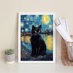 Quadro decorativo cat night starry art 45x34cm - com vidro Moldura: madeira branca Informações do produto tire todas as suas dúvidas no descritivo abaixo: decoração para quarto, sala, cozinha, escritório, área gourmet e muito mais. Chega de paredes vazias medidas - cada peça tem 45x34cm a3 . Material do papel - papel fotográfico brilhante de altíssima resolução acabamento - todos os quadros são acompanhados de vidro para proteção da imagem. - moldura em madeira maciça na cor preta ou branca conforme produto escolhido e pendurador . - os quadros são embalados de forma segura com plástico bolha com camada dupla de acordo com o tamanho dos quadros. Garantia - garantia de 3 meses. Meu quadro chegou. Como posso fixá-lo Você precisa apenas de um martelo e um prego, pois os quadros já vão acompanhados de penduradores. Esta é a forma mais indicada. Como posso limpar meu quadro A limpeza é feita como um móvel comum da sua casa. Apenas um pano seco ou espanador são suficientes para tal Ean: 7895569056789