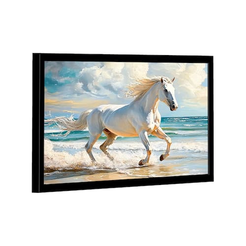 Quadro Decorativo Cavalo Branco na Praia Moldura Preta - 60x40cm -