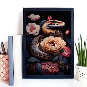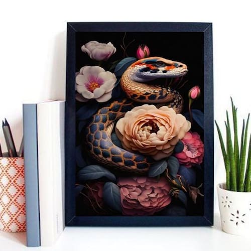 Quadro decorativo cobra com flores 45x34cm - com vidro Moldura: madeira branca Informações do produto tire todas as suas dúvidas no descritivo abaixo: decoração para quarto, sala, cozinha, escritório, área gourmet e muito mais. Chega de paredes vazias medidas - cada peça tem 45x34cm a3 . Material do papel - papel fotográfico brilhante de altíssima resolução acabamento - todos os quadros são acompanhados de vidro para proteção da imagem. - moldura em madeira maciça na cor preta ou branca conforme produto escolhido e pendurador . - os quadros são embalados de forma segura com plástico bolha com camada dupla de acordo com o tamanho dos quadros. Garantia - garantia de 3 meses. Meu quadro chegou. Como posso fixá-lo Você precisa apenas de um martelo e um prego, pois os quadros já vão acompanhados de penduradores. Esta é a forma mais indicada. Como posso limpar meu quadro A limpeza é feita como um móvel comum da sua casa. Apenas um pano seco ou espanador são suficientes para tal
