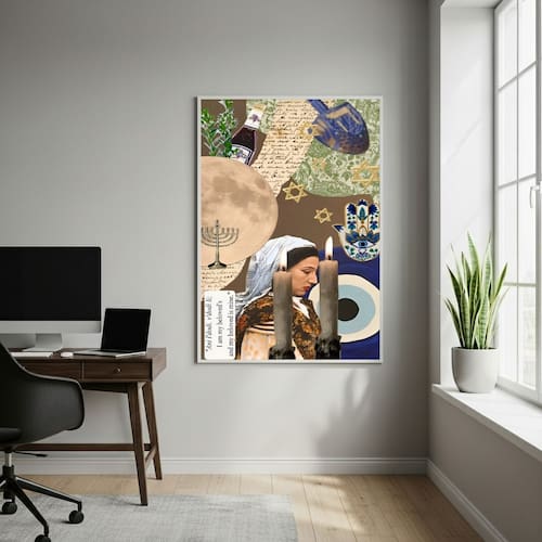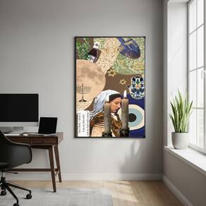 Quadro Decorativo Colagem Símbolos Judaicos - 70x50cm - Cor: Moldura Branca
