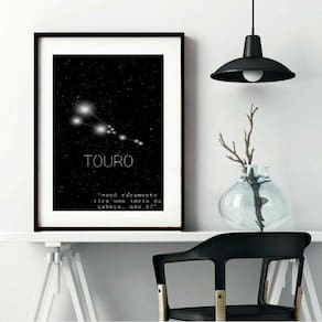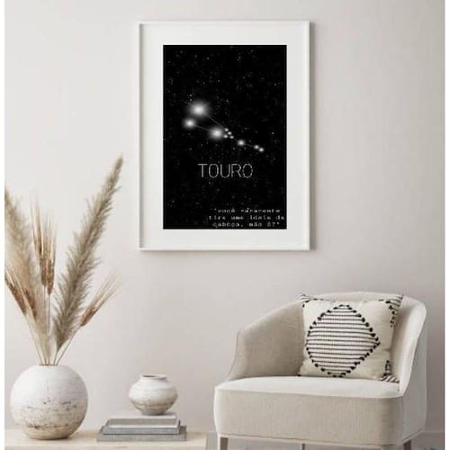 Quadro decorativo constelação signo touro - 60x48cm Moldura: madeira branca Informações do produto tire todas as suas dúvidas no descritivo abaixo: decoração para quarto, sala, cozinha, escritório, área gourmet e muito mais. Chega de paredes vazias medidas - cada peça tem 60x48cm . Material do papel - papel fotográfico brilhante de altíssima resolução acabamento - todos os quadros são acompanhados de vidro para proteção da imagem. - moldura em madeira maciça na cor preta ou branca conforme produto escolhido e pendurador. - paspatur branco com 7cm de largura - os quadros são embalados de forma segura com plástico bolha com camada dupla de acordo com o tamanho dos quadros. Garantia - garantia de 3 meses. Meu quadro chegou. Como posso fixá-lo Você precisa apenas de um martelo e um prego, pois os quadros já vão acompanhados de penduradores. Esta é a forma mais indicada. Como posso limpar meu quadro A limpeza é feita como um móvel comum da sua casa. Apenas um pano seco ou espanador são suficientes para tal Ean: 7893139439833