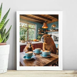 Quadro decorativo cozinha - capivaras 24x18cm - com vidro Moldura: madeira branca Informações do produto tire todas as suas dúvidas no descritivo abaixo: decoração para quarto, sala, cozinha, escritório, área gourmet e muito mais. Chega de paredes vazias medidas - cada peça tem 24x18cm a5 . Material do papel - papel fotográfico brilhante de altíssima resolução acabamento - todos os quadros são acompanhados de vidro para proteção da imagem. - moldura em madeira maciça na cor preta ou branca conforme produto escolhido e pendurador . - os quadros são embalados de forma segura com plástico bolha com camada dupla de acordo com o tamanho dos quadros. Garantia - garantia de 3 meses. Meu quadro chegou. Como posso fixá-lo Você precisa apenas de um martelo e um prego, pois os quadros já vão acompanhados de penduradores. Esta é a forma mais indicada. Como posso limpar meu quadro A limpeza é feita como um móvel comum da sua casa. Apenas um pano seco ou espanador são suficientes para tal