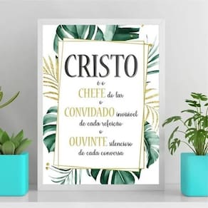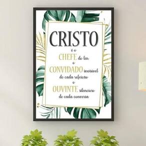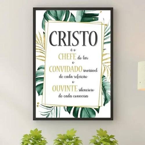 Quadro decorativo cristo é o chefe do lar 24x18cm Cor: moldura preta Informações do produto tire todas as suas dúvidas no descritivo abaixo: decoração para quarto, sala, cozinha, escritório, área gourmet e muito mais. Chega de paredes vazias medidas - cada peça tem 24x18cm a5 . Material do papel - papel fotográfico brilhante de altíssima resolução acabamento - todos os quadros são acompanhados de uma película de acetato para proteção da imagem. - os quadros são embalados de forma segura com plástico bolha com camada dupla de acordo com o tamanho dos quadros. Garantia - garantia de 3 meses. Meu quadro chegou. Como posso fixá-lo Você precisa apenas de um martelo e um prego, pois os quadros já vão acompanhados de penduradores. Esta é a forma mais indicada. Caso prefira, você pode utilizar uma fita dupla face neste caso, sugerimos de alta qualidade para evitar que descole e seu quadro caia . Como posso limpar meu quadro A limpeza é feita como um móvel comum da sua casa. Apenas um pano seco ou espanador são suficientes para tal
