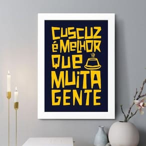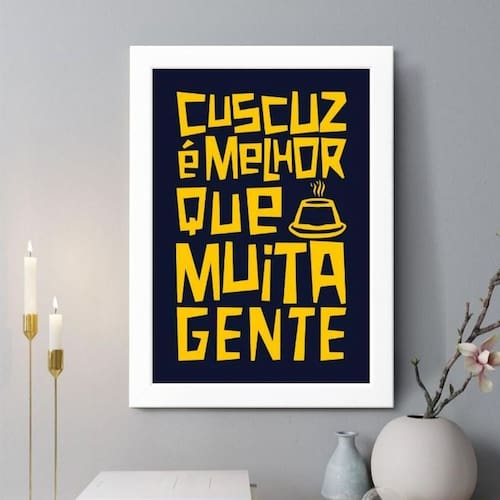 Quadro decorativo cuscuz é melhor que muita gente 45x34cm - com vidro Cor: moldura preta Informações do produto tire todas as suas dúvidas no descritivo abaixo: decoração para quarto, sala, cozinha, escritório, área gourmet e muito mais. Chega de paredes vazias medidas - cada peça tem 45x34cm a3 . Material do papel - papel fotográfico brilhante de altíssima resolução acabamento - todos os quadros são acompanhados de vidro para proteção da imagem. - moldura em madeira maciça na cor preta ou branca conforme produto escolhido e pendurador . - os quadros são embalados de forma segura com plástico bolha com camada dupla de acordo com o tamanho dos quadros. Garantia - garantia de 3 meses. Meu quadro chegou. Como posso fixá-lo Você precisa apenas de um martelo e um prego, pois os quadros já vão acompanhados de penduradores. Esta é a forma mais indicada. Como posso limpar meu quadro A limpeza é feita como um móvel comum da sua casa. Apenas um pano seco ou espanador são suficientes para tal