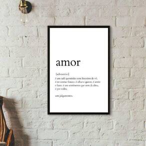 Quadro decorativo definição de amor 45x34cm - com vidro Moldura: madeira preta Informações do produto tire todas as suas dúvidas no descritivo abaixo: decoração para quarto, sala, cozinha, escritório, área gourmet e muito mais. Chega de paredes vazias medidas - cada peça tem 45x34cm a3 . Material do papel - papel fotográfico brilhante de altíssima resolução acabamento - todos os quadros são acompanhados de vidro para proteção da imagem. - moldura em madeira maciça na cor preta e pendurador . - os quadros são embalados de forma segura com plástico bolha com camada dupla de acordo com o tamanho dos quadros. Garantia - garantia de 3 meses. Meu quadro chegou. Como posso fixá-lo Você precisa apenas de um martelo e um prego, pois os quadros já vão acompanhados de penduradores. Esta é a forma mais indicada. Como posso limpar meu quadro A limpeza é feita como um móvel comum da sua casa. Apenas um pano seco ou espanador são suficientes para tal