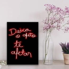 Quadro decorativo deixa o afeto te afetar 24x18cm Moldura: madeira preta Informações do produto tire todas as suas dúvidas no descritivo abaixo: decoração para quarto, sala, cozinha, escritório, área gourmet e muito mais. Chega de paredes vazias medidas - cada peça tem 24x18cm a5 . Material do papel - papel fotográfico brilhante de altíssima resolução acabamento - todos os quadros são acompanhados de uma película de acetato para proteção da imagem. - os quadros são embalados de forma segura com plástico bolha com camada dupla de acordo com o tamanho dos quadros. Garantia - garantia de 3 meses. Meu quadro chegou. Como posso fixá-lo Você precisa apenas de um martelo e um prego, pois os quadros já vão acompanhados de penduradores. Esta é a forma mais indicada. Caso prefira, você pode utilizar uma fita dupla face neste caso, sugerimos de alta qualidade para evitar que descole e seu quadro caia . Como posso limpar meu quadro A limpeza é feita como um móvel comum da sua casa. Apenas um pano seco ou espanador são suficientes para tal Ean: 7896599074996