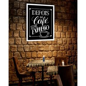 Quadro decorativo depois do café eu me expresso - 70x50cm Cor: moldura preta Informações do produto tire todas as suas dúvidas no descritivo abaixo: decoração para quarto, sala, cozinha, escritório, área gourmet e muito mais. Chega de paredes vazias medidas - cada peça tem 70x50cm . Material do papel - papel fotográfico brilhante de altíssima resolução acabamento - todos os quadros são acompanhados de vidro para proteção da imagem. - moldura em madeira maciça na cor preta ou branca conforme produto escolhido e pendurador. - os quadros são embalados de forma segura com plástico bolha com camada dupla de acordo com o tamanho dos quadros. - de 3 meses. Meu quadro chegou. Como posso fixá-lo Você precisa apenas de um martelo e um prego, pois os quadros já vão acompanhados de penduradores. Esta é a forma mais indicada. Como posso limpar meu quadro A limpeza é feita como um móvel comum da sua casa. Apenas um pano seco ou espanador são suficientes para tal Marca: Não Informado Ean: 7901039770526