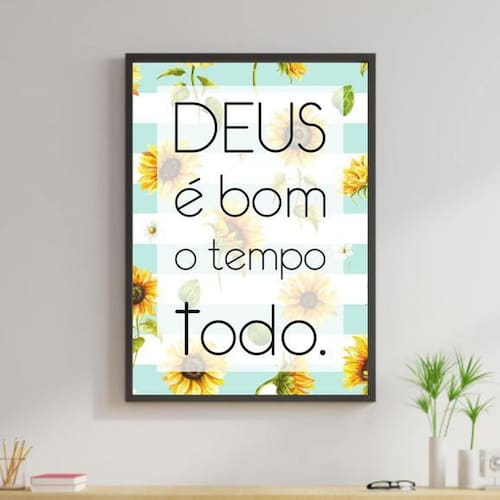 Quadro decorativo deus é bom o tempo todo - girassol 34x23cm - moldura branca Tamanho: a4 20 x 30 Acabamento: película de acetato Moldura: madeira branca Informações do produto
